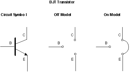A BJT can approximate a single-pole-single-throw (SPST) switch between terminals C and E by changing the voltage across terminals B and E. The transistor is turned ON (closing the circuit between C and E, thereby allowing current to flow between these terminals) by applying a positive voltage of about 1 volt across BE. (The arrow between B and E indicates the direction of the control current; a small current from B to E will allow a much larger current to flow from C to E - the direction is important!.) Then the On Model shown below gives a reasonable approximation for the how the transistor behaves. The transistor is turned OFF (opening the circuit between C and E, thereby preventing current from flowing between these terminals) by removing the control voltage and shutting off the current from B to E. The model for this state is the Off Model shown below. Note that the function of the transistor is very similar to the function of the relay in Part II.