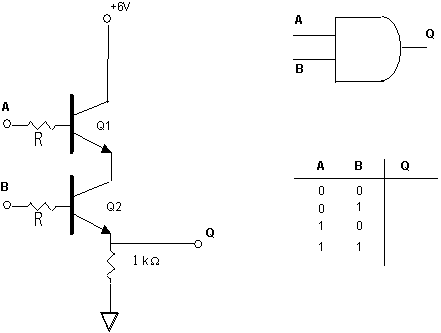 4. Configure an AND gate using a pair of transistors as shown in Figure 4. The output of an AND gate is HIGH only if both inputs are HIGH, and LOW otherwise. Control the input signals as discussed in the previous problem. This AND gate circuit is very sensitive to the values selected for the resistors which may differ depending on the individual transistors used - even different transistors from the same bin. (This is one reason that the RTL logic gates that we have constructed has been superceded by TTL gates that we will use in the next lab.) Experiment to find the value of R required for proper operation for all possible inputs. The logic symbol and truth table for the AND gate are shown below. Verify the operation of this circuit by fabricating it on your breadboard and filling out a separate truth table (including actual voltages measured) in your notebook.