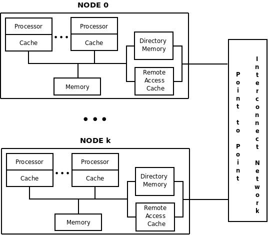 The DASH multiprocessor and cache coherency protocol were developed to have a scalable shared-memory architecture. With current processors adding more and more cores on a single die, scalable memory architectures are of interest. The above figure shows a simple layout for the DASH multiprocessor. |