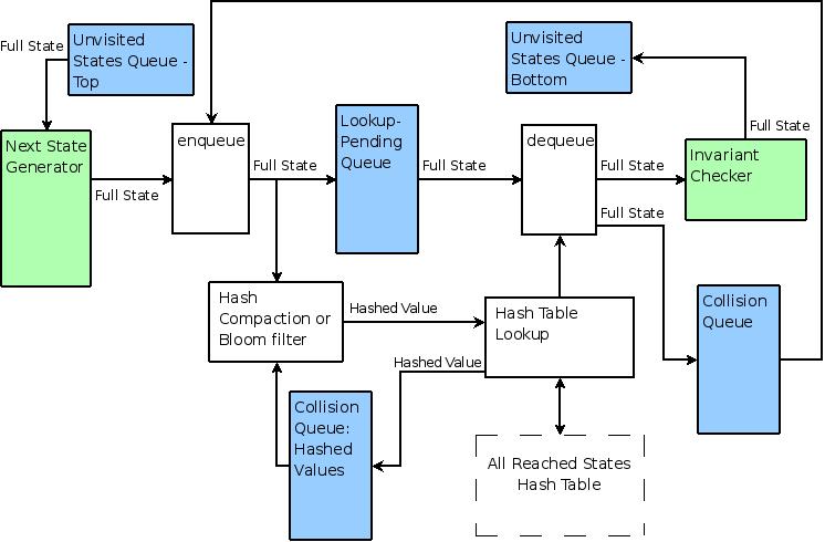 PHAST is a pipelined hardware implementation of the Murφ verifier. States start in the Next State Generator, and stored in the Lookup Pending Queue while they are hashed and looked up in the hash table.