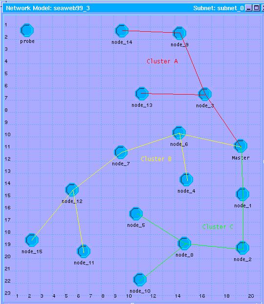The available frequency band is divided into sub-bands and each sub-band is assigned to a cluster of nodes. A cluster of nodes is deployed in the same general geographical region. The neighboring clusters are assigned different frequency bands to assure low interference. Each cluster communicates with the master node through its first level node. Figure shows the network topology created using the network editor of Opnet. The network consists of a single master node and fifteen sensor nodes. Sensor nodes are divided into three clusters. Master node uses frequency group M. Sensor nodes are assigned frequency groups A, B, and C, as shown in the figure. The lines connecting the nodes represent the virtual communication paths created by the acoustic modems. The details of this work can be found in the following papers: