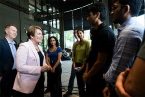 Massachusetts Gov. Maura Healey, Boston Mayor Michelle Wu, state economic development and technology leaders and other officials visited Northeastern’s Boston campus on Thursday to learn from university professors how artificial intelligence can solve some of the most pressing issues in the state and the world.
