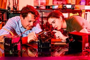 Matthew O’Rourke and Rachel Rakushkin are working on making cheaper satellite components. Photos by Matthew Modoono/Northeastern University