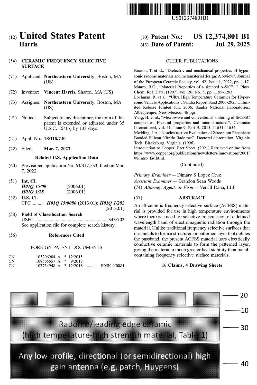 ECE University Distinguished and William Lincoln Smith Professor Vincent Harris was awarded a patent for developing a “Ceramic frequency selective surface.”