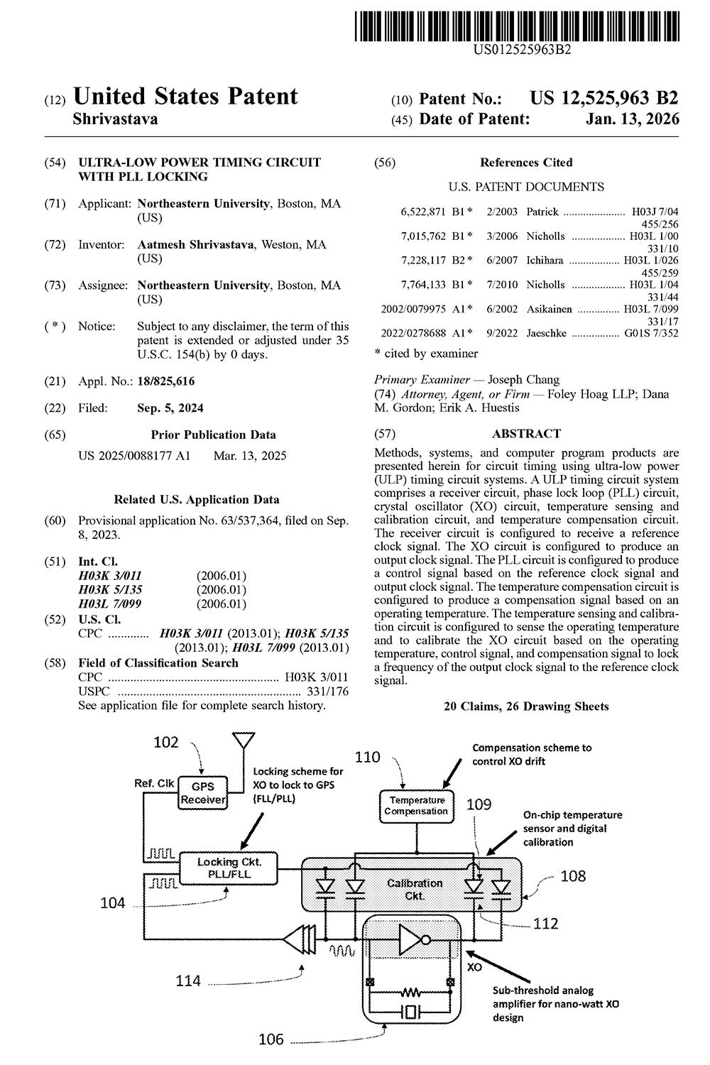 ECE Associate Professor Aatmesh Shrivastava was awarded a patent for “Ultra-low power timing circuit with PLL locking.”