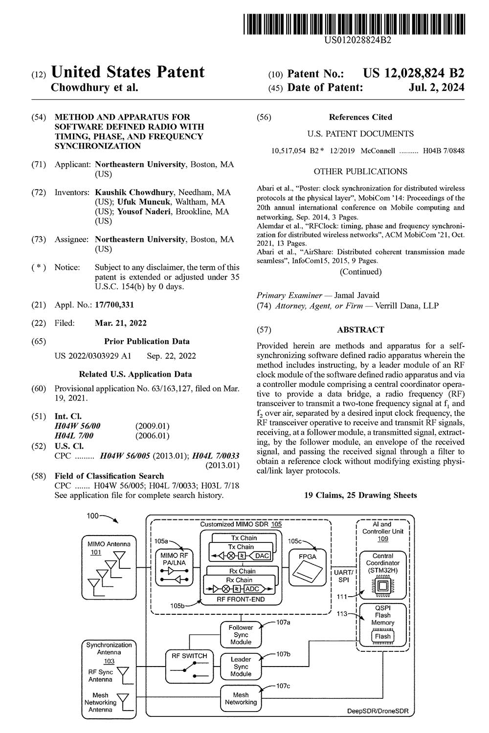 ECE Professor Kaushik Chowdhury, and Research Assistant Professors Ufuk Muncuk and Yousof Naderi were awarded a patent for “Method and apparatus for software defined radio with timing, phase, and frequency synchronization.”