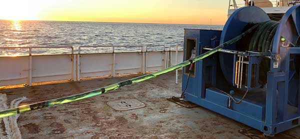 The 160-hydrophone array, partially rolled onto the tow cable winch, deployed into Massachusetts Bay in September 2021. Credit: Matthew Schinault, Purnima Ratilal