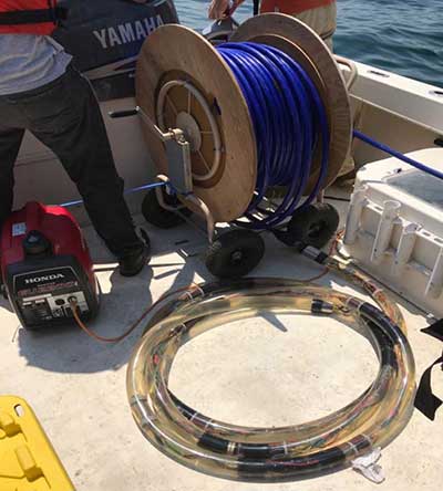 Early in the project, the team snaked the array along the floor of the Renaissance Parking Garage to slide the electronics into a protective rubber-like tube. With their pump and five-gallon buckets of vegetable oil, they filled the tube with oil to prevent the device from imploding under intense ocean water pressures.