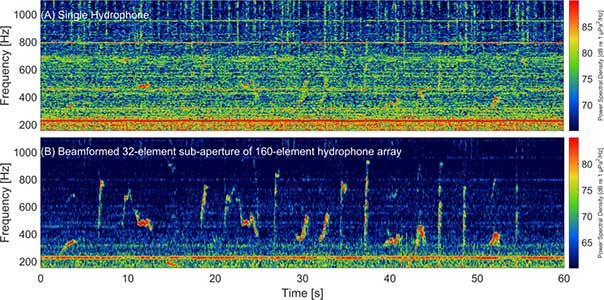 Additionally, using a technique called “beamforming,” the researchers can greatly increase the signal-to-noise ratio with hydrophone arrays. After identifying the direction of the sound, they enhance the sound in that direction and suppress noise coming from elsewhere.